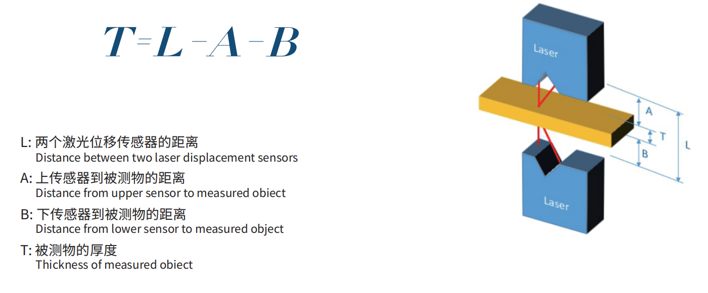 测量原理 测厚模块:两个激光位移传感器上下对射的方式组成,两个传感器分别测量被测体上表面的位置和下表面的位置,通过计算得到被测体的厚度。