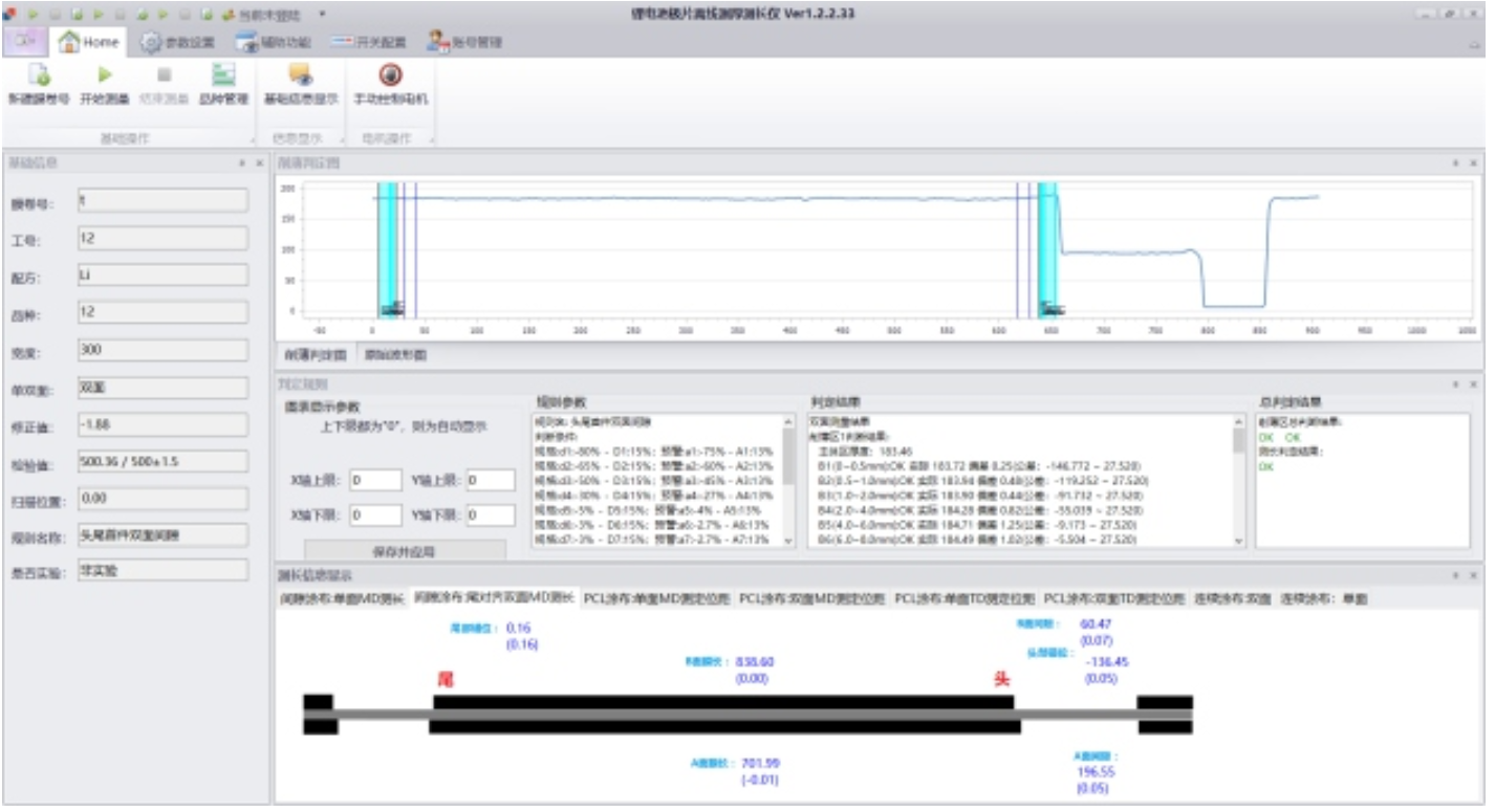 尺寸:通过运动模组+光栅尺带动上下同步的 CCD 相机/激光传感器,从极片头部运行至极片尾部,计算出极片涂膜区纵向长度、间隙长度、A/B 面头尾错位长度等。