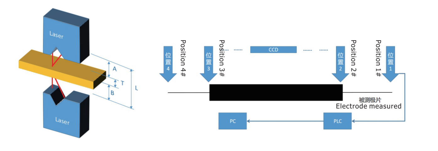厚度:由两个激光位移传感器上下对射的方式组成的,上下的两个传感器分别利用三角形测量法,发射一束激光至被测物表面,通过检测反光位置即可测量出被测物上表面的位置和下表面的位置,通过计算得到被测物的厚度。如由下图 : 极片厚度 C=L-A-B